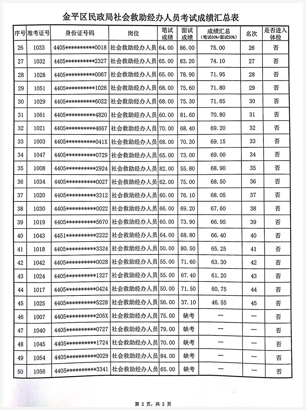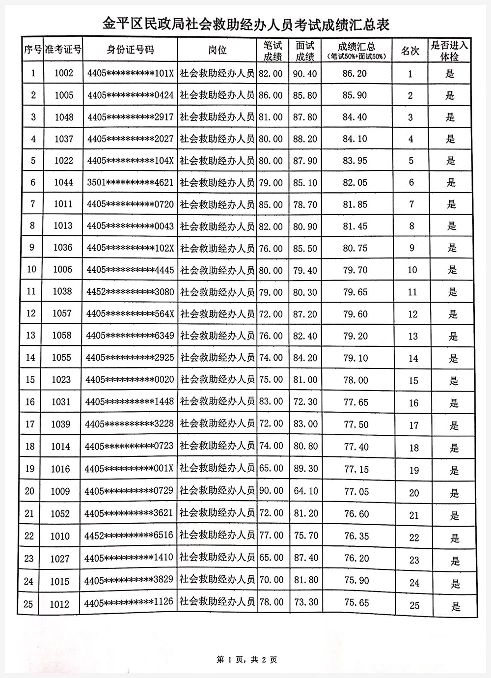 1.入围体检名单,详见附件《金平区民政局社会救助经办人员考试成绩汇总表》。