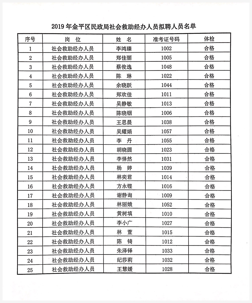 根据《金平区民政局公开招聘社会救助经办人员公告》规定和要求,经资格审查、考试、体检等环节,李鸿臻等25位同志资格审查、考试成绩、体检结果均符合聘用条件,现予以公示。公示期间,如对拟聘用人选有异议,请向汕头市金平区保安服务有限公司反映。