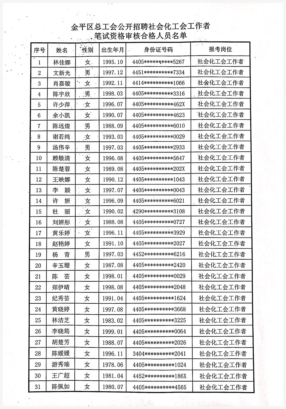 根据《汕头市金平区总工会公开招聘社会化工会工作者公告》及汕头市金平区总工会对报名人员资格审核结果,现将进入笔试人员名单及相关事宜通知如下: