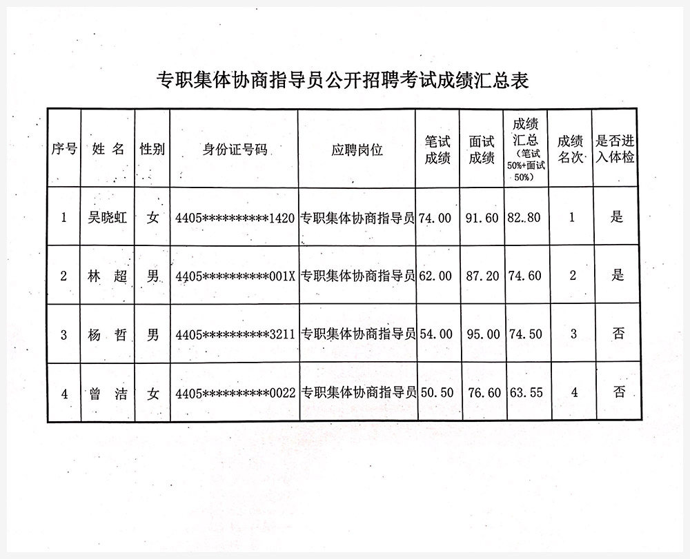 1.入围体检名单,详见附件《专职集体协商指导员公开招聘考试成绩汇总表》。